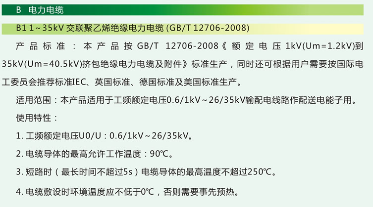 一、產品標準 本產品按GB/T 12706-2008《額定電壓1kv(Um=1.2kv)到35kv(Um=40.5kv》)擠包絕緣電力電纜及附件》標準生產,同時還可根據(jù)用戶需要按國際電工委員會推薦標準IEC、英國標準、德國標準及美國標準生產。