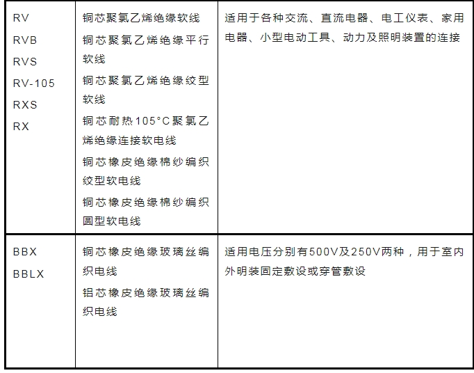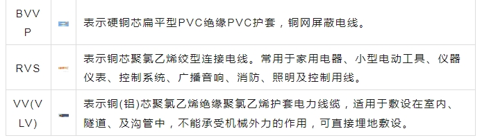 注:B(B)——第一個字母表示布線,第二個字母表示玻璃絲編制。V(V)——第一個字母表示聚乙烯(塑料)絕緣,第二個字母表示聚乙烯護套。L(L)——鋁,無L則表示銅F(F)——復合型R——軟線S——雙絞X——絕緣橡膠